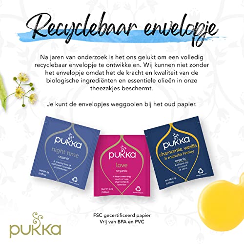 Laat de drukte en spanning van de dag los en neem wat tijd voor jezelf met deze selectie van kalmerende kruidentheeën, die speciaal is samengesteld om je een moment van welverdiende ontspanning te bieden. De Pukka Relax Kruidenthee bundel bevat Chamomille, Vanilla & Manuka Honey thee, Love thee (met biologische roos, kamille, vlierbloesem, lavendel, zoethout, lindebloesem en goudsbloem) en Night Time thee (met een dromerige mix van biologische haverbloesem, valeriaan, kalmerende lavendel en zijdezachte lindebloesem), 20 zakjes van elke variant. Laat de kruiden tot 15 minuten in vers gekookt water trekken. Door alleen de hoeveelheid water te koken die je nodig hebt, wordt elk kopje Pukka thee zo duurzaam mogelijk. Bij Pukka willen we mensen inspireren om gezonder en gelukkiger te leven met de kracht van kruiden. Elke biologische kruidenthee van Pukka wordt deskundig samengesteld door onze master herbsmith en mede-oprichter Sebastian Pole, waarbij enkel gebruik wordt gemaakt van kruiden en specerijen van de hoogste kwaliteit – met het hoogste niveau aan essentiële oliën en actieve ingrediënten – die op een eerlijke en duurzame manier geteeld zijn – over de hele wereld. De combinatie van deze pure ingrediënten en ons toonaangevende kruidenonderzoek leidt tot Pukka’s holistische kruiden cadeautjes. Al onze producten worden gemaakt met gebruik van hernieuwbare energie, we zijn een gecertificeerde B Corp organisatie. Pukka is bovendien aangesloten bij 1% for the Planet en doneert jaarlijks 1% van haar omzet om milieuprojecten over de hele wereld te ondersteunen. Pukka is daarnaast Fair for Life en FairWild gecertificeerd. Deze bundel is het perfecte cadeau voor theeliefhebbers die graag gezond leven en verantwoord met de planeet willen omgaan. Deze biologische thee is ook ideaal om jezelf mee te verwennen.