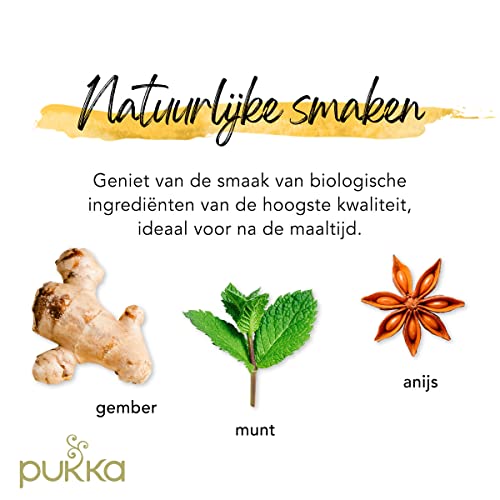 De Pukka Digestion bundel bevat drie soorten biologische kruidenthee om de spijsvertering te ondersteunen: Three Mint, Feel New en Three Ginger (20 theezakjes van elke variant). Laat je eten landen en vind verfrissing na de maaltijd met deze biologische ingrediënten. Vele kruiden – zoals pepermunt, kurkuma, gember, zoethout en venkel – staan erom bekend jouw lichaam te kunnen helpen bij het herstel van het evenwicht. Laat de kruiden tot 15 minuten in vers gekookt water trekken. Door alleen de hoeveelheid water te koken die je nodig hebt, wordt elk kopje Pukkathee zo duurzaam mogelijk. Bij Pukka willen we mensen inspireren om gezonder en gelukkiger te leven met de kracht van kruiden. Elke biologische kruidenthee van Pukka wordt deskundig samengesteld door onze Master Herbsmith en mede-oprichter Sebastian Pole, waarbij enkel gebruik wordt gemaakt van kruiden en specerijen van de hoogste kwaliteit – met het hoogste niveau aan essentiële oliën en actieve ingrediënten. De combinatie van deze pure ingrediënten en ons toonaangevende kruidenonderzoek leidt tot Pukka’s holistische kruiden cadeautjes.
