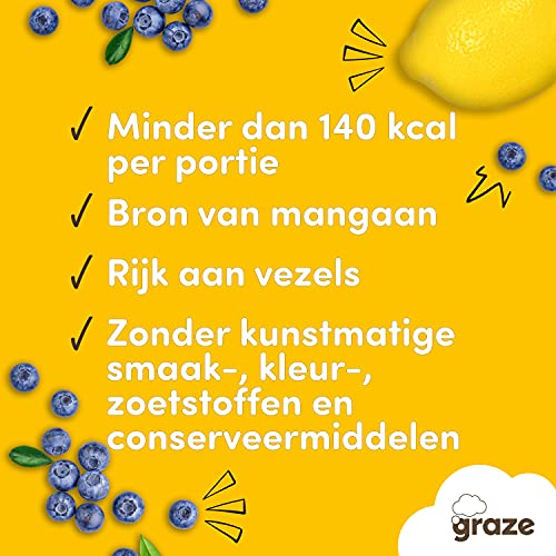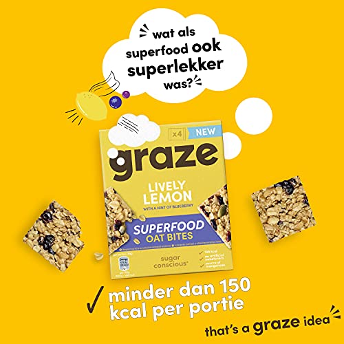 Wat als lekker bezig ook goed bezig was? Met onze Graze Lively Lemon Superfood Oat Bites kun je lekker en verantwoord snacken op elk moment van de dag. Dus of je nu onderweg bent of iets zoekt tegen je middagdip, Graze staat voor je klaar met verrassende en lekkere snacks. Deze Graze Lively Lemon Superfood Oat Bites is een echte superheld. De natuurlijke zoetstof cichoreiwortelvezel zorgt dat je snack toch lekker zoet is, maar minder suiker bevat en slechts 138 kcal per portie. We hebben frisse citroen gemengd met volkoren havervlokken, cranberry, blauwe bes en de superkracht van baobab (apenbroodboom). Daardoor is deze reep een bron van mangaan, wat bijdraagt aan een normaal energieleverend metabolisme. Het is een heerlijk tussendoortje en ook nog eens rijk aan vezels. Deze Lively Lemon havermoutrepen zijn ook geschikt voor vegetariërs. Bij Graze gaat het om twee dingen: smakelijke, verantwoorde ingrediënten en fantasie. Deze combinatie heeft geleid tot snacks met unieke smaakcombinaties en goede voedingswaarden. That’s a graze idea! Onze snacks zijn zeer veelzijdig en daarom het perfecte, verantwoorde tussendoortje. Ze gaan goed samen met een drankje of een goede film. De snacks die vol zitten met proteïne zijn ideaal voor of na een work-out. Al onze snacks bevatten natuurlijke ingrediënten en hebben evenwichtige voedingswaarden – zo bevatten ze altijd proteïne, vezels, essentiële mineralen en vitaminen. We gebruiken bovendien nooit kunstmatige smaakstoffen, kleurstoffen, conserveermiddelen of zoetstoffen.