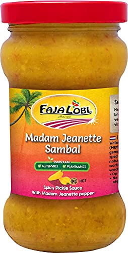 Faja lobi madame jeanette sambal is een traditionele gele sambal voor gebruik als smaakmaker bij surinaamse gerechten, alsmede voor de bereiding van surinaamse dressing en dipsaus.