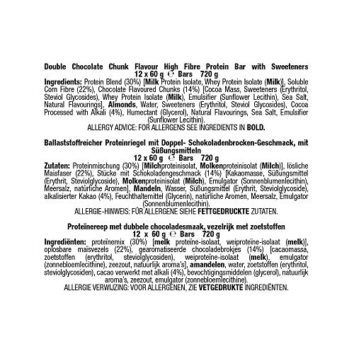 proteïne mix( MELK PROTEïNE ISOLAAT, WEI PROTEïNE ISOLAAT (MELK)), oplosbare maïsvezels, chocoladesmaak brokken( cacaomassa, zoetstoffen( erythritol, steviolglycosiden), WEI PROTEïNE ISOLAAT (MELK), emulgator( zonnebloemlecithine), zeezout), AMANDELEN, water, zoetstoffen( erythritol, steviolglycosiden), cacao( verwerkt met alkali)(4%), bevochtigingsmiddelen( glycerol), natuurlijk aroma, zeezout, emulgator( zonnebloemlecithine)